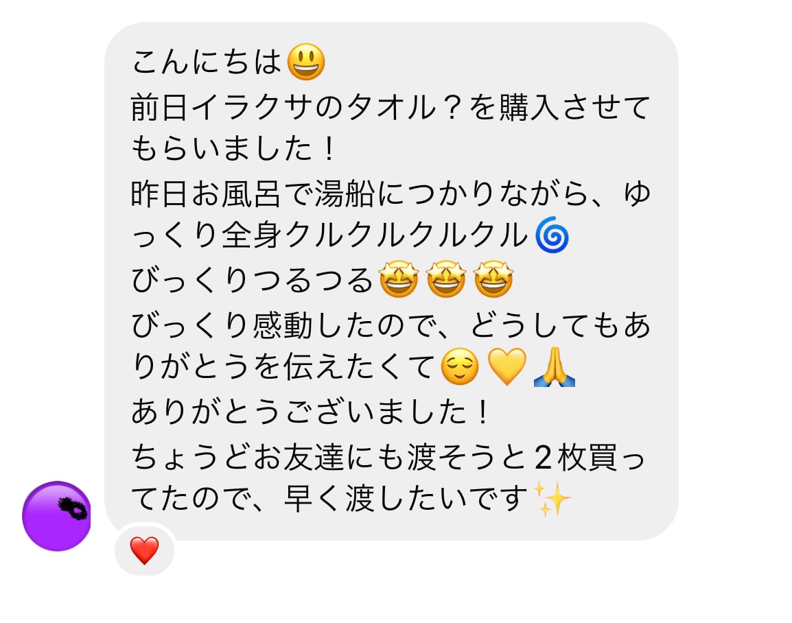 前日イラクサのタオル?を購入させてもらいました!昨日お風呂で湯船につかりながら、ゆっくり全身クルクルクルクル